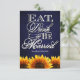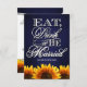 Eat Drink and Be Married Rustic Wedding RSVP Cards-match the invitations and more found below on this page. Compliment your sunflower wedding theme with these rsvp cards that feature a blue chalkboard as a background with "Eat, Drink & Be Married" in fun & elegant script with vibrant sunflowers at the bottom of the front and back of each card.These wedding RSVP cards are set to high quality basic card stock; however, you can change the stock to linen, felt (embossed), recycled, and several metallic shades if you would like under number 2 (choose your style, size & paper type) below the orange add to cart button. A list of the additional costs for a fancier card stock are displayed also under that option. Each RSVP card comes with a fitted white envelope.