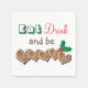 "Eat, drink and be merry" slogan with gingerbread heart shaped cookies and holly decoration on Christmas cocktail napkins.