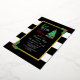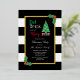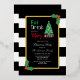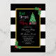 Eat, drink and be merry Christmas holiday party invitation featuring a Christmas tree and gifts against a gold frame. Black and white striped background with holly