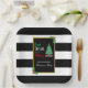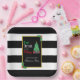 Eat, drink and be merry holiday party featuring a Christmas tree and gifts against a gold frame. Black and white striped background with holly