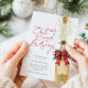 Celebrate in style with this Eat, Drink and Be Merry holiday party invitation featuring a champagne bottle tied with a red bow, accented by winter berries and festive greenery. Perfect for Christmas gatherings, cocktail parties, or seasonal celebrations. See our collection for more matching holiday party designs.