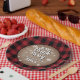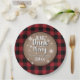 A fun, classic pattern of black and red buffalo check background with a kraft paper style centre, cute snowflake accents with your personalised Christmas message for your festive party guests.