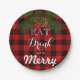 Eat Drink and be Merry, red tartan plaid,pine cone Paper Plate