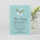 Ornaments of utensils, decked out with winter holly and tied with pretty little bows - a great design to invite guests to your home to "Eat, drink and be Merry!" this holiday season. With white elements, dark chocolate brown typography, on a soft aqua teal background.