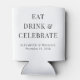 Chic can coolers for your wedding reception, rehearsal dinner, engagement party, and other wedding parties featuring "Eat Drink & Celebrate," your names and your wedding date in elegant serif typography.