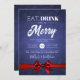 Elegant Christmas Party / Holiday Party / Winter Party Invitation template with "Eat, Drink & Be Merry" typography design & Winter Wonderland snow motif in Navy. Great to use for Corporate dinner parties, Winter balls and galas, black tie / events and office parties.