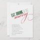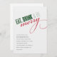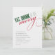 This holiday party invitation features the words "eat, drink and be merry" in modern elegant typography. The words are in green and red and the invitation is set on a white background. The details of your part are displayed below in grey text