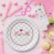 Set of eight 9” paper plates with the phrase “Eat Me” printed in red script across a grey and white chequerboard with a red heart accent. Red border. See the entire Wonderland Plate collection in the FOOD/BEV | Dishes section.