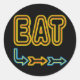 EAT retro art based on a vintage neon restaurant sign. The letters are yellow and red, the arrows are blue, red and yellow. Fun, funky advertising art for people who cook or eat.