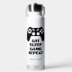 Eat Sleep Game Repeat funny water bottle for gamer. Cool Birthday gift idea for kids and adults who love gaming. Black and white controller design with humourous quote. Personalise with your own name.