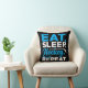 Eat Sleep Hockey Repeat design with blue and white text on a black background, a great design on pillows, mugs, stickers, and other items for hockey players!