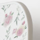 On a cute, floral pattern, "Eat Sleep Pickleball Repeat" is in green outlined text on this girly pickelball paddle. The background is white, while the flower pattern is in shades of pink and green.