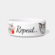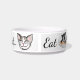 Cat bowl with fun illustrations to the words: Eat - Sleep - Play - Repeat …