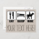Eat Sleep Ride a Horse Equestrian Horseback Riding Postcard: A fun, customisable postcard for serious horseback riders. Could be used as an invitations for riding classes and activities. Just replace the placeholder text - Your Text Here! - with your own custom message, like a name, slogan, short announcement, etc.