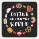 Colourful circle of iconic foods with country flags: pizza, sushi, tacos, burgers, croissants, pretzels and noodles. For food lovers and travelers who enjoy global flavours.