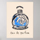 Eau de parfum French perfume slogan with a fashion illustration from an original artwork by artist Sacha Grossel of a blue perfume vintage perfume bottle. This watercolour illustration of a luxury brand perfume is in pop art style and the background colour is customisable.
