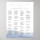 Wedding guest seating chart in dark grey and white with coastal watercolor detailing along the bottom features "please find your seat" at the top in elegant calligraphy script lettering, with your guest table assignments beneath, arranged alphabetically across four rows. Accommodates up to ~100 guests; use the design tool to reduce font size if more space is needed.
