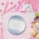 This coastal chic wedding paper plate design matches our Ebb Tide collection, featuring sheer watercolor washes of dusty periwinkle blue along the top and bottom, with your custom text in soft grey lettering.