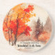 Inspirational quote scripture round sandstone coaster depicts a beautiful fall watercolor landscape including trees with colourful red and orange autumn leaves. It features Bible Verse Ecclesiastes 3:11, "He has made everything beautiful in its time."