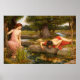 To the left, Echo watches from partial cover near a tree trunk. Her pose is cautious and longing, as though she wants to step forward but cannot. The soft pink drapery and warm skin tones contrast with the cool greens and browns of the landscape, making the figures feel exposed against nature’s calm. Waterhouse balances romance and unease, letting the gentle setting amplify the story’s emotional distance: one figure consumed by self, the other held back by silence.