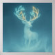 A white, almost transparent deer emerges from an icy blue haze. Its antlers are made of geometric light.