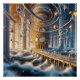 The warm, golden light emanating from the central clock contrasts beautifully with the cool, deep blues of the surrounding water and sky, hinting at both dawn and dusk, past and future. This piece is a perfect blend of intricate detail, fantastical architecture, and a sense of nostalgic awe, making it ideal for those who appreciate art that stimulates the imagination and celebrates the beauty of instrumental music's narrative power.