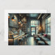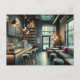 The painting captures a moody and stylish scene inside a small, eclectic, hip café in Seattle. The café's interior combines urban and rustic elements, featuring exposed brick walls alongside modern metallic fixtures. The colour scheme is dominated by dark greys with vibrant neon accents, creating a trendy, youthful ambiance. The furniture is an intriguing mix of vintage plush sofas and minimalist bar stools, adding to the eclectic charm. A prominent glass door opens to the busy street outside, linking the café's intimate interior with the city's dynamic life. Artistic details such as abstract paintings and industrial-style lamps contribute to the hip atmosphere, while unique, geometric-shaped lights cast soft, ambient lighting, creating intriguing shadows and enhancing the overall moody and fashionable vibe of the café.