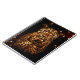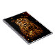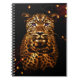 Eclipse Majesty, showcase a leopard with glowing golden fur and distinctive spots, set against a dark background. The leopard's eyes are illuminated in bright purple, creating a striking and mystical effect. The dark surroundings are accented by scattered, warm lights, giving the scene a dramatic almost otherworldly atmosphere.