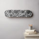 A skateboard with interesting and diverse abstract design consisting of various circular shapes in different styles connected by thin lines like a network or ecosystem.
