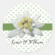 Lovely wedding envelope seal done in a white and green polka dot, with graphics of a white edelweiss bloom, on a green band, across the middle. Black text is ready to personalise with the bride and groom's name. Lovely finishing touch to our Edelweiss and Polka Dot Wedding set.