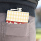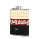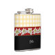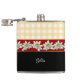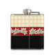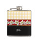 Pretty drinking flask done in the German flag colours of red, yellow, and black, with a yellow and white gingham checked pattern, on the top half of the flask. The bottom half of the flask is done in solid black, with graphics of a gold edged red ribbon, with white edelweiss flowers, across the middle. Personalise the white text, on the front, for yourself or as a charming gift idea.