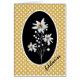 Lovely little note card done in a golden yellow and white polka dot pattern background. Beautiful graphic artwork of a bunch of white alpine flowers called Edelweiss decorate the middle, with a black oval framing them from behind. Personalise all of the text to suit your needs.