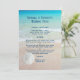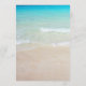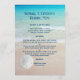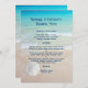 Wedding menu template with beach scene background and white sand dollar. There is bold script at the top for a title that can include the names of the couple. All menu items are listed in paragraph form so you can decide how you want it to look. The sample menu is divided into sections for appetizers, entrées and desserts. The back of the paper has the same beach scene without the sand dollar.