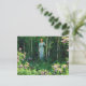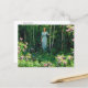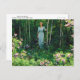 A fine art postcard featuring the painting, Edge of the Woods (1921) by Charles Courtney Curran (1861-1942), an American impressionist artist. A landscape depicting a woman in a blue dress among the trees in the woods, with mountain laurel bushes bearing pink flowers in the foreground.