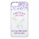 A phone case with a unicorn drawing. A fluffy cloud at the end of a rainbow in the background. Pink and purple watercolor confetti decorate the top border. The text says: I want to be a Unicorn so I can stab idiots with my head. Funny, edgy and cute.