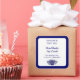 An editable candle or baking sticker qwith script and block letters and rustic woodcut flowers in blue with a deep blue border on a square label with round edges.