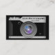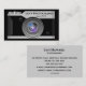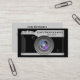 This editable business card features a camera on the front with editable text (company name and slogan). On the back are the editable details of the business. You can also change the font style, size and colour as well as the background colour on the back. This business card can be used for photographers, camera shops, etc.
