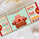 Invite everyone to the big tent for a spectacular birthday party at the circus with our vintage mint circus ticket invitation templates. This circus ticket birthday invitations features red circus tent with glowing light signboard on a pale brown vintage style admit one ticket design. Colour theme is fully editable! click customise to change the background colour. Design reverse to a circus tent personalise with your little one's name on an editable background colour. Now, come one, come all, step right up to the greatest circus party on earth!