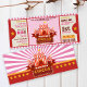 Invite everyone to the big tent for a spectacular birthday party at the circus with our vintage pink circus ticket invitation templates. This circus ticket birthday invitations features red circus tent with glowing light signboard on a pale brown vintage style admit one ticket design. Colour theme is fully editable! click customise to change the background colour. Design reverse to a circus tent personalise with your little one's name on an editable background colour. Now, come one, come all, step right up to the greatest circus party on earth!