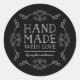 Stylish sticker with the words "Hand Made with Love" between flourishes all in white against an editable background colour (click customise to change). This sticker is great for crafters and makers of handmade goods, like artists, knitters, dressmakers. It can be used when gifting your handmade goods or as product labels.