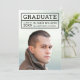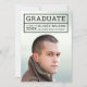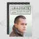 Modern photo graduation announcement card with the graduate's details within a grid. Card has a white stripes pattern against an editable background colour (click customise to change) back side.