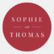 This wedding sticker features the names of the wedding couple in white against an editable background colour; to change it from red to a colour of your choice, click the customise button.