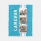A sporty varsity style blanket with 3 photos arranged one below the other in front of a line of white stripes all against an editable background colour (click "customise" to change background colour).