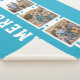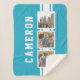 A sporty varsity style blanket with 3 photos arranged one below the other in front of a line of white stripes all against an editable background colour (click "customise" to change background colour).