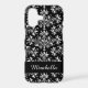 An editable iPhone case with elegant script letters in white on a black ribbon and a floral damask pattern in back on white.