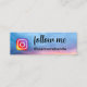 This editable business card will help spread the word about your social media presence! It features the instagram icon (which can be changed to any icon), and the words "follow me" along with your user name. On the back is your social media contact information. All text is editable so change the details as well as the font style, size and colour. It is set against a blue and pink sunset sky. Photo credit: Quino Al, 2016.