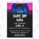 This editable invitation features a picture of a controller against a neon background with the details of the birthday party below. The details are editable so go ahead and change the information as well as the font style, size and colour. On the back is an editable field for additional information. Photo credit: Brian J. Tromp, 2022.