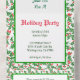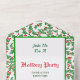 An editable Holiday party all-in-one invitation template with script letters and room for your party info on a rustic background pattern of green holly with red berries.