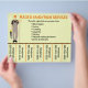 This editable handyman phone number flyer features an illustration of a handyman to the left (this can be changed with a photo of your own) and the details of the business to the right. Below is the phone number for your clients. The text is editable so go ahead and change the details as well as the font style, size and colour. The background colour can be changed, too.