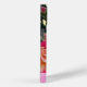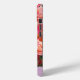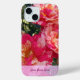 An editable phone case with purple script letters and elegant floral photography of pink and white striped roses blooming on a heirloom floribunda rose, with a pink tinted translucent background for your name.